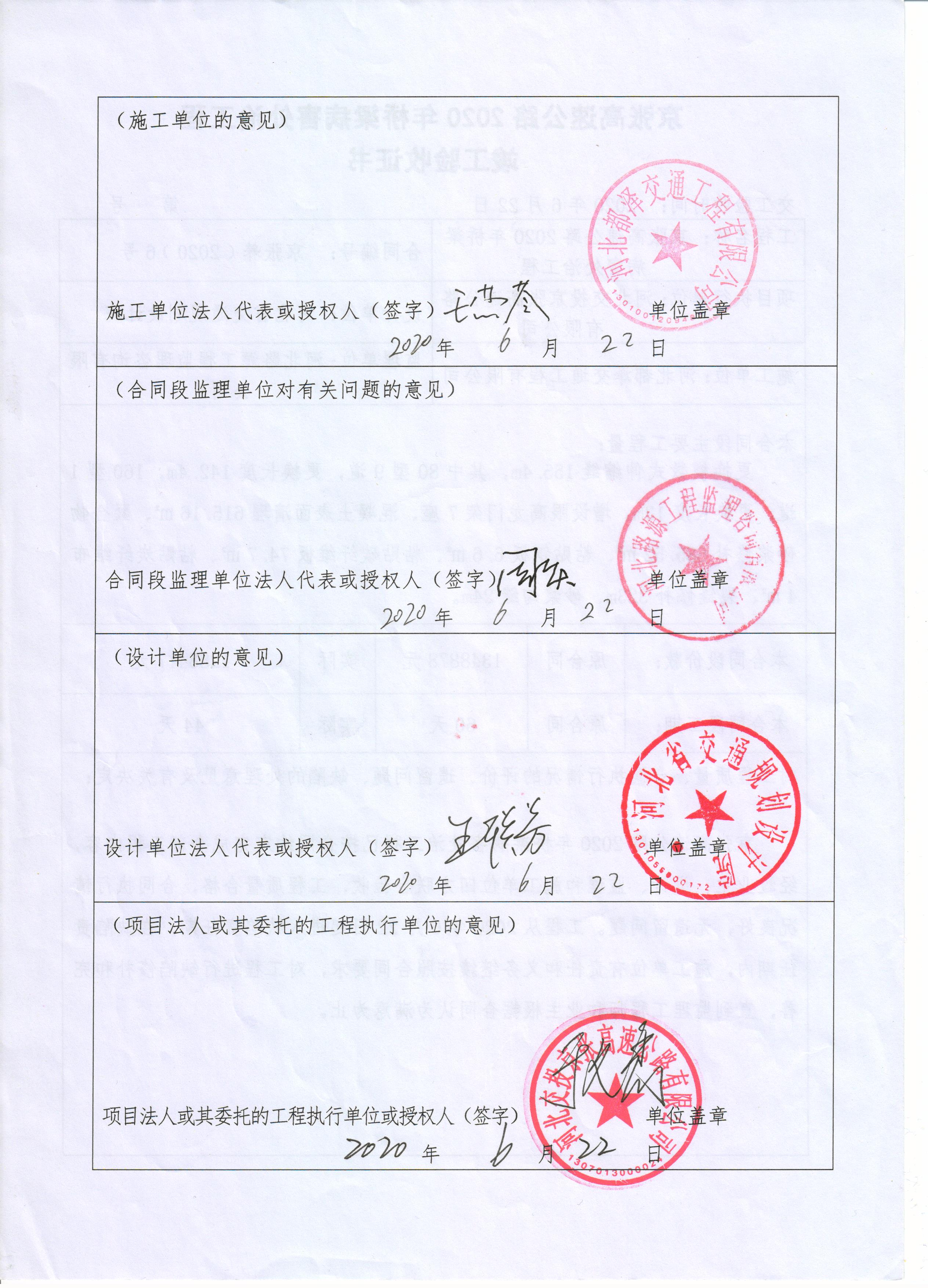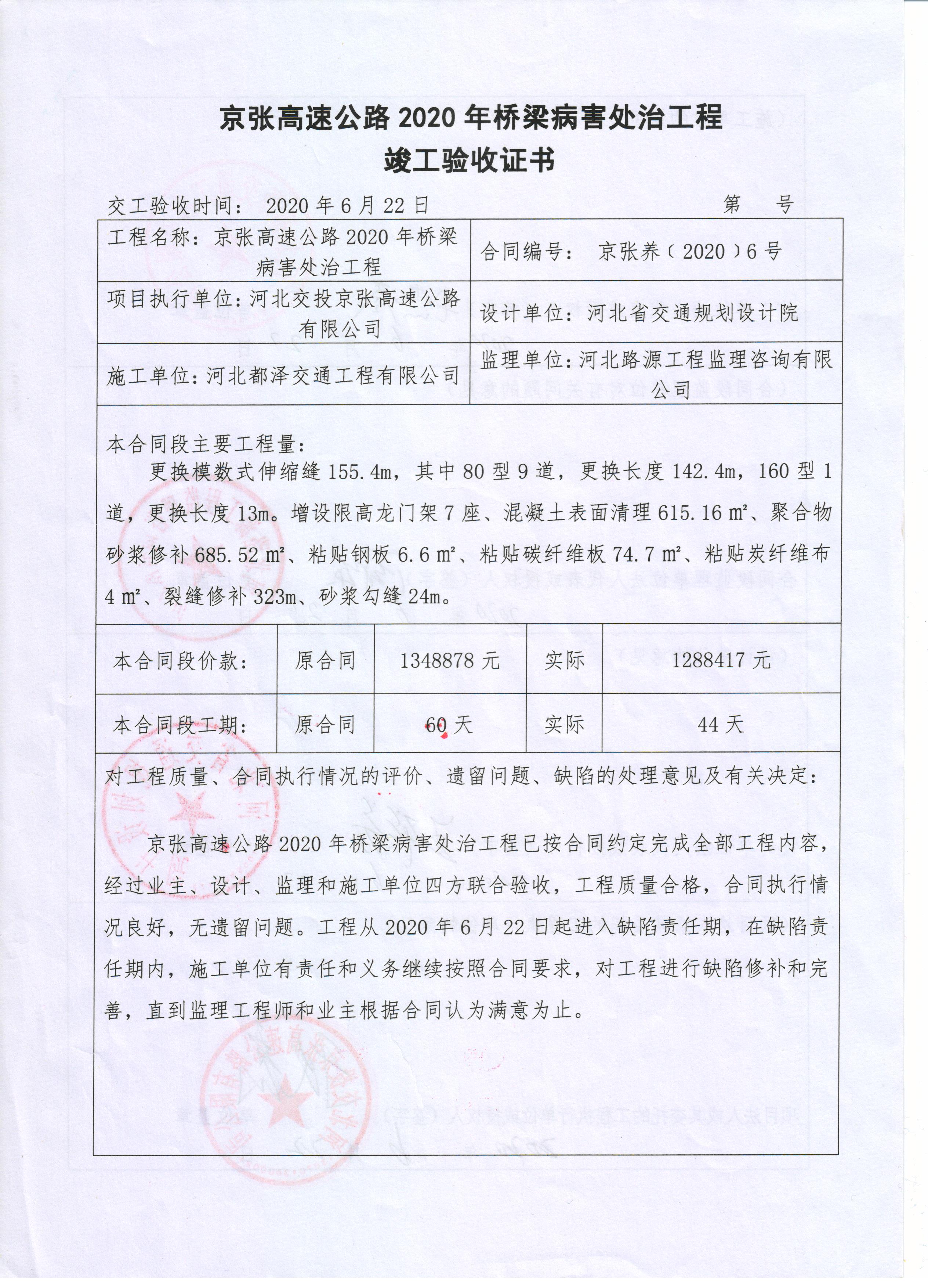 京張高速公路2020年橋梁病害處治工程竣工驗收證書