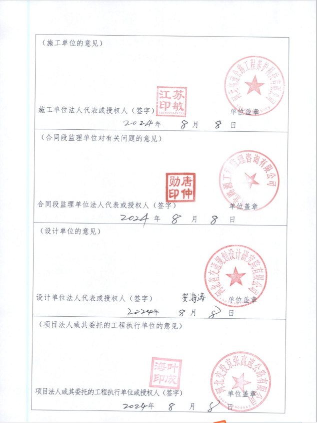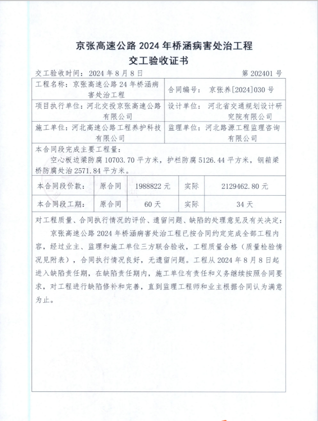 京張高速公路2024年橋涵病害處治工程交工驗收證書