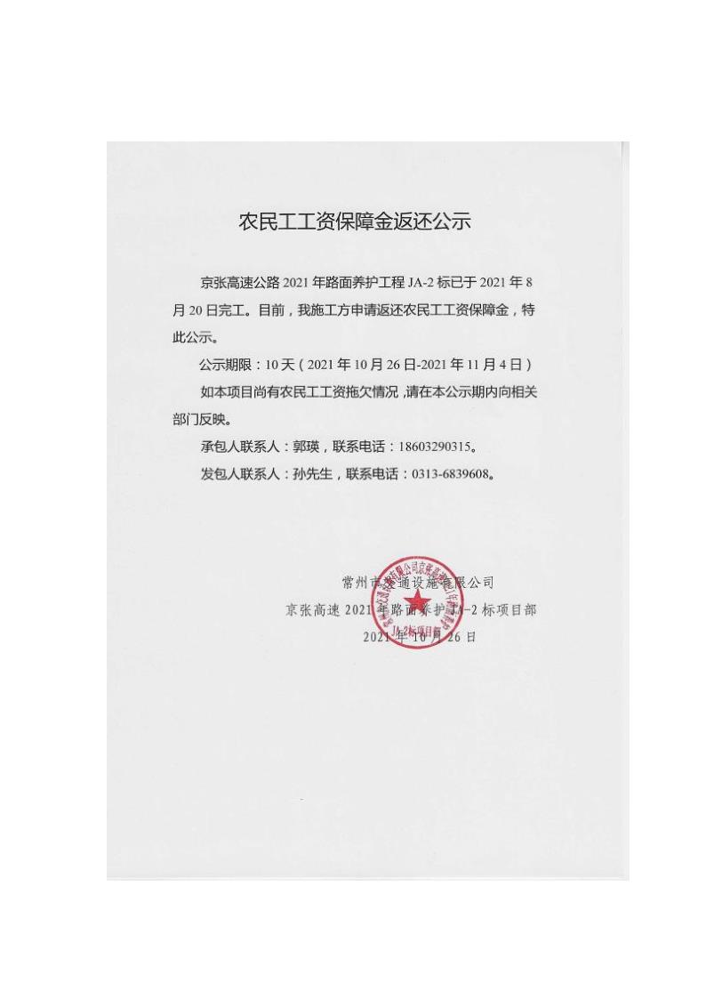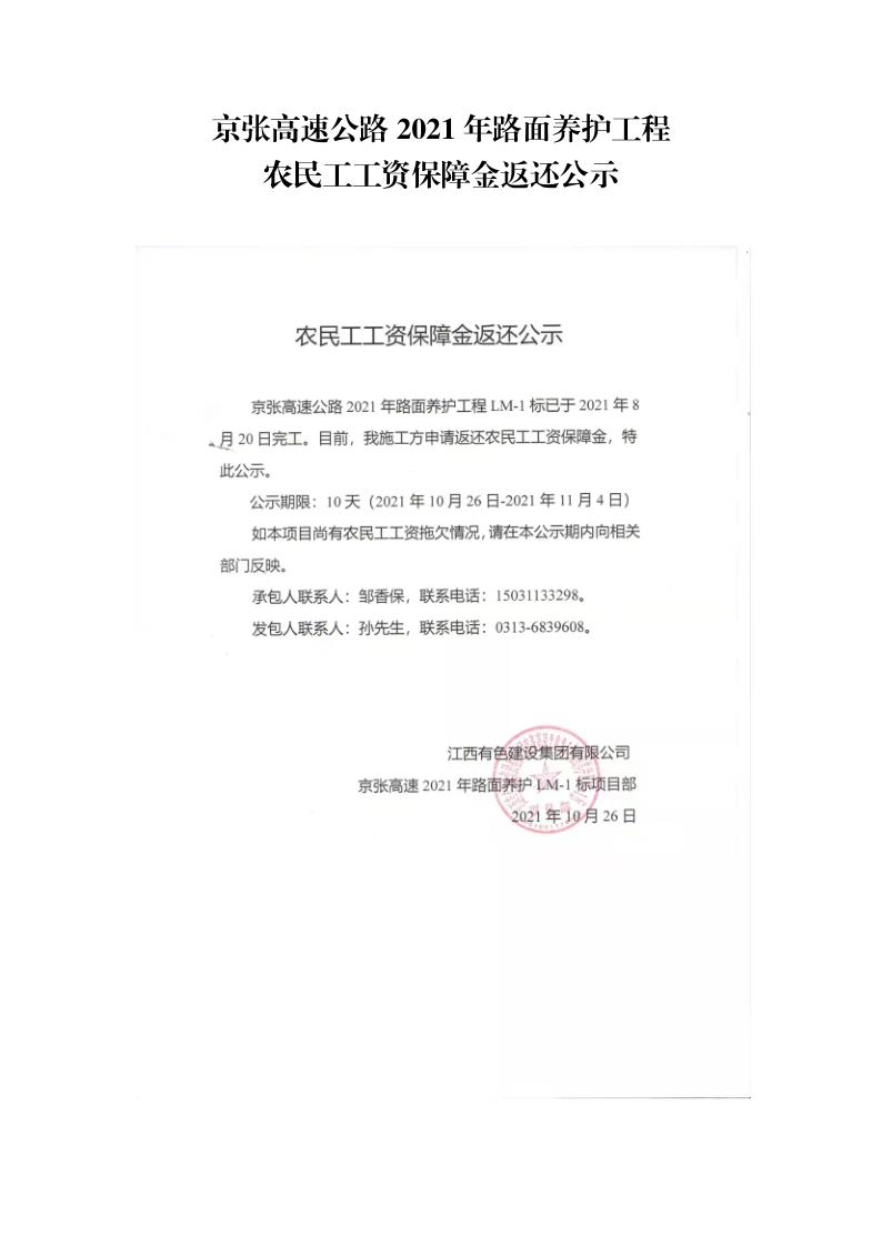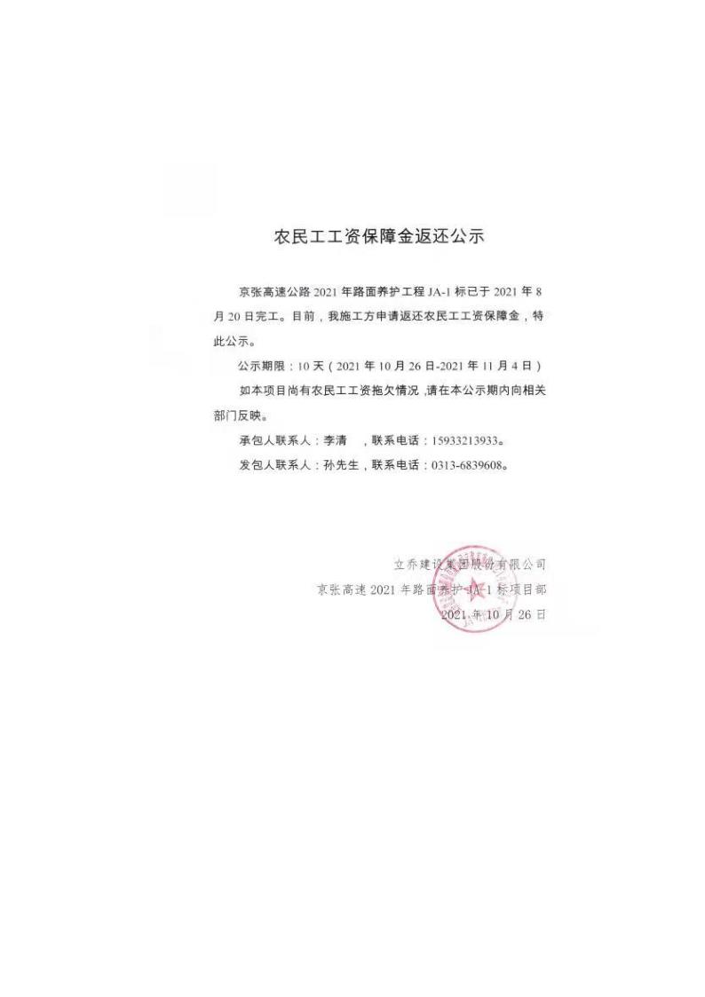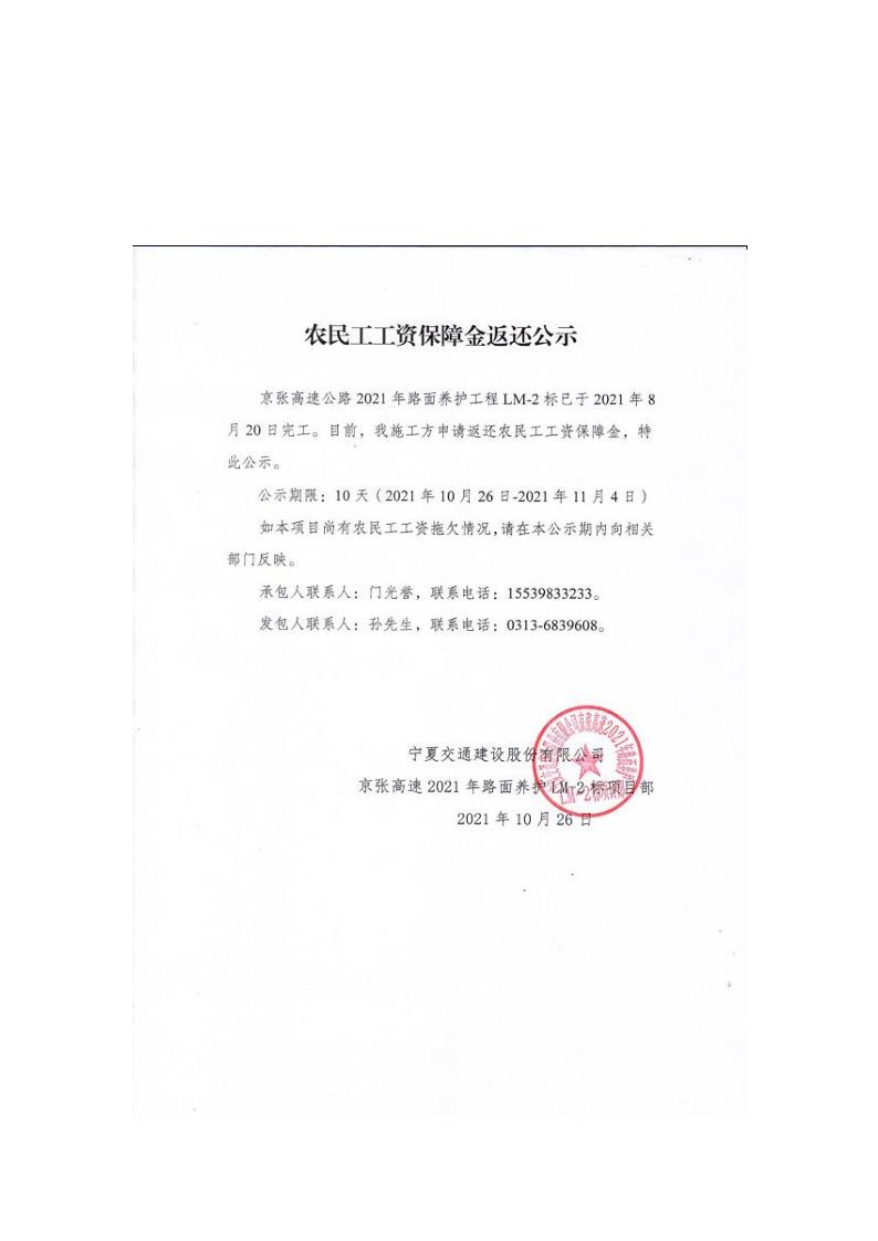 2021年路面養護工程農民工工資保障金返還公示